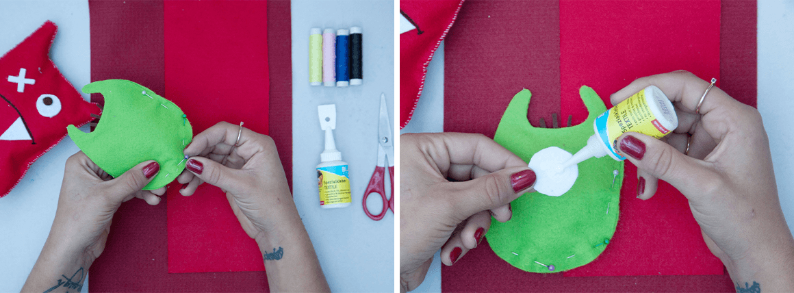 2. Verpasst eurem Monster nun ein gruseliges Gesicht. Dazu könnt ihr z.B. die Augen, die Zähne, den Mund und Haare aus Filzstoff schneiden und mit dem BLANCOL Spezialkleber TEXTILE ganz einfach aufkleben. Alles gut andrücken und trocknen lassen.