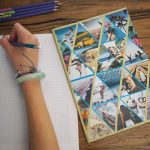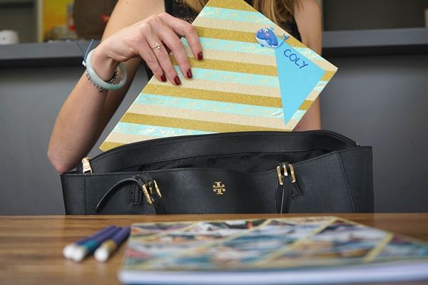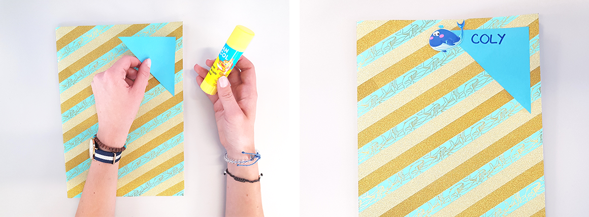 3. Wenn ihr dann fertig seid mit dem Einbinden eures Heftes, könnt ihr noch aus Papier mit eurer Lieblingsfarbe ein Dreieck oder ein Kreis oder sonst ein lustiges Muster ausschneiden und auf die Vorderseite des Heftes kleben um es mit eurem Namen und dem Schulfach zu beschriften. Noch ein kleiner Wal-Sticker auf mein Namensschild und schon ist das Heft fertig.